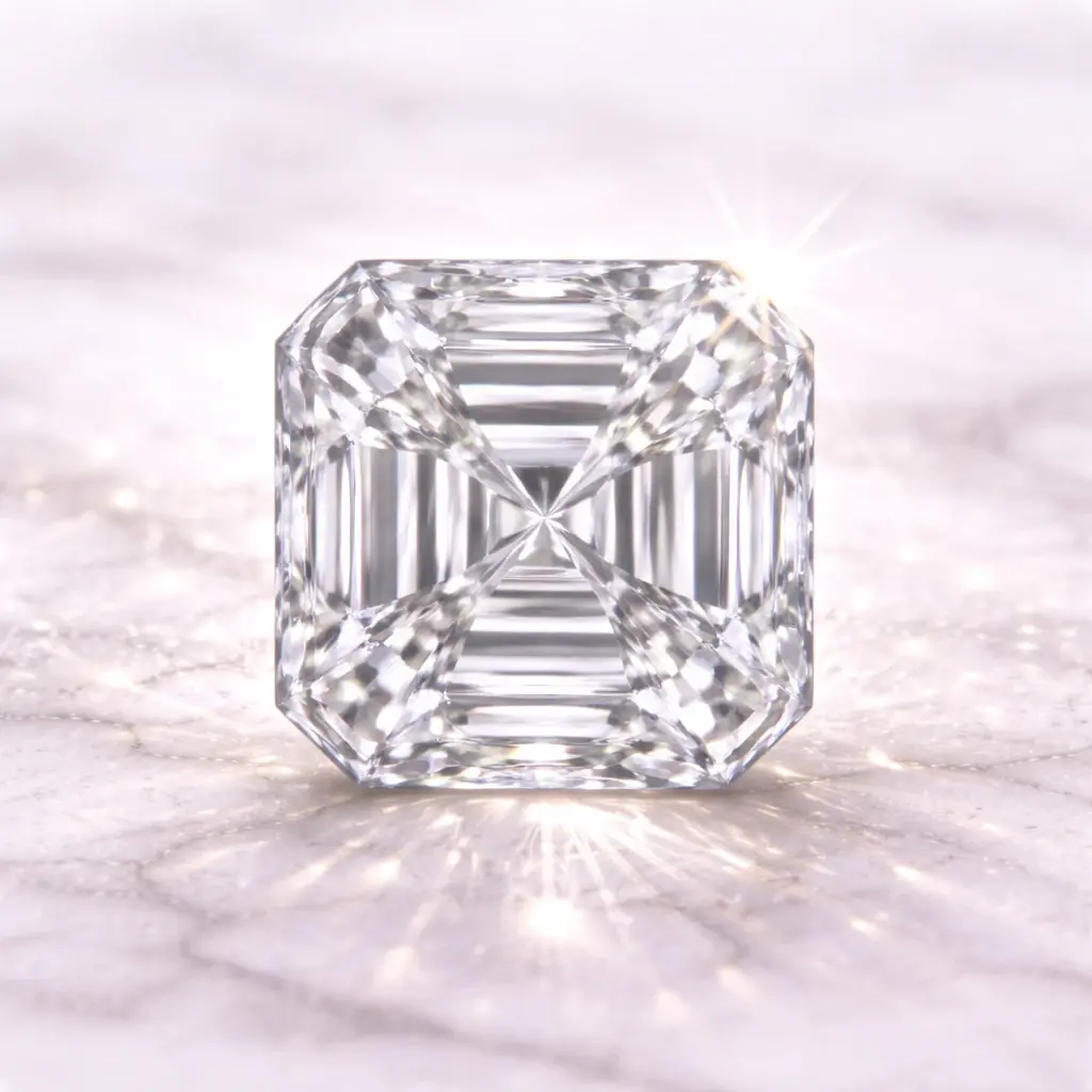 The Asscher cut diamond features a square shape with step-cut facets and a vintage-inspired design. Known for its geometric symmetry and depth, this diamond shape highlights clarity and delivers an elegant, architectural look.